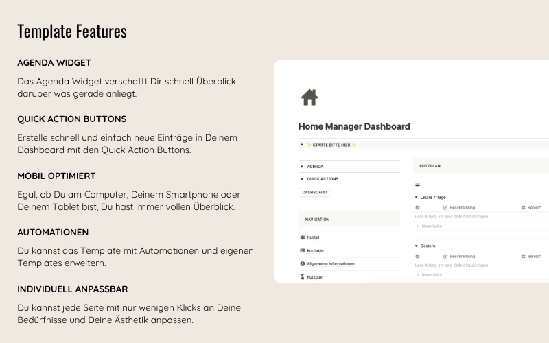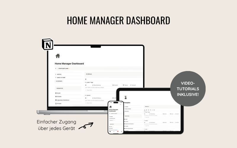 Das Home Manager Dashboard für Notion ist dein digitales Zuhause für alles rund um Haushalt, Ordnung und Organisation.