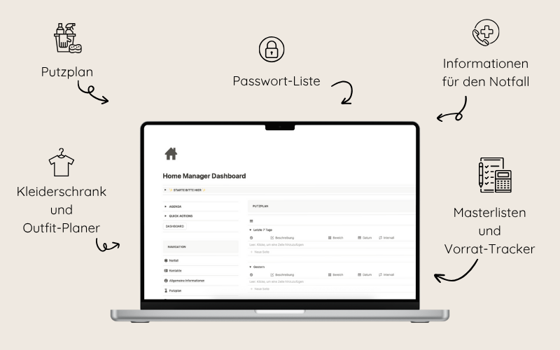 Mit dem Home Manager Dashboard für Notion organisierst du dein ganzes Zuhause an einem Ort – von Putzplan bis Passwortliste.