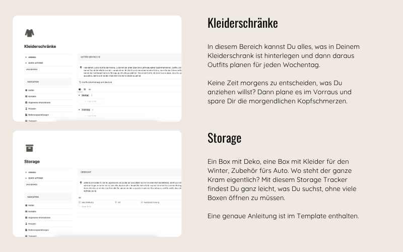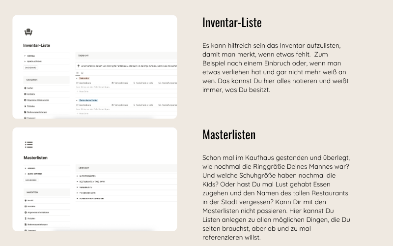 Der Kleiderschrank-Manager, die Masterlisten und die Übersicht über Transportmittel bringen zusätzliche Klarheit in deinen Alltag. Sogar deine Bedienungsanleitungen, Lieblingsrestaurants und Kleidergrößen finden hier einen Platz.